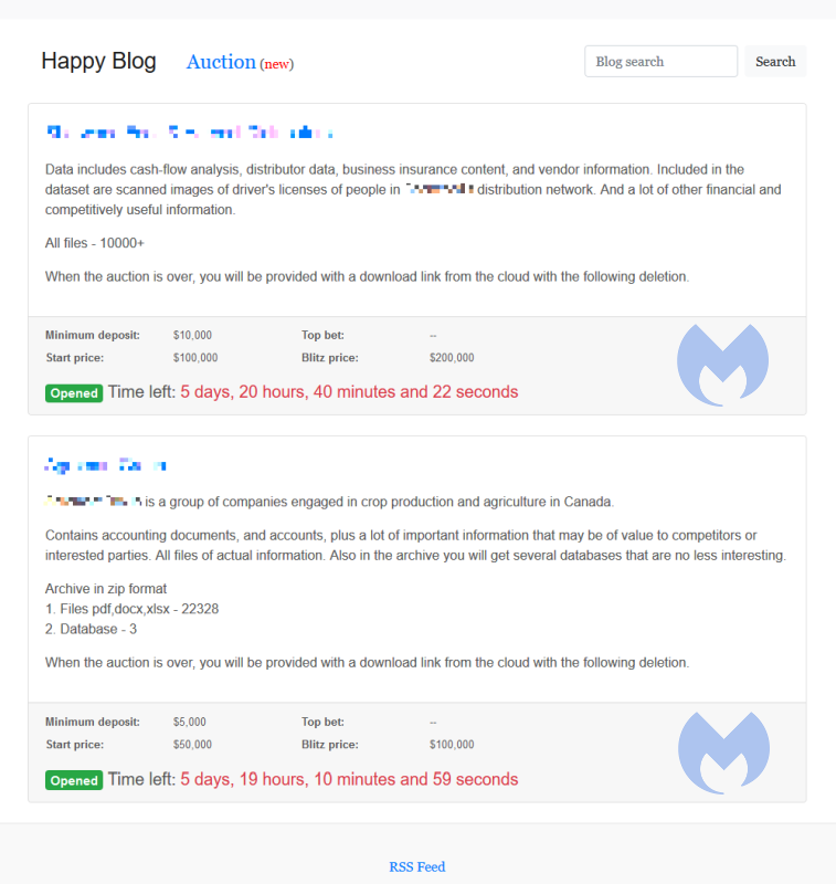 The ransomware gang already ran a site called “Happy Blog” where they post samples of the stolen data and then threaten to release the actual files to the public. For the auction site they use this new format: