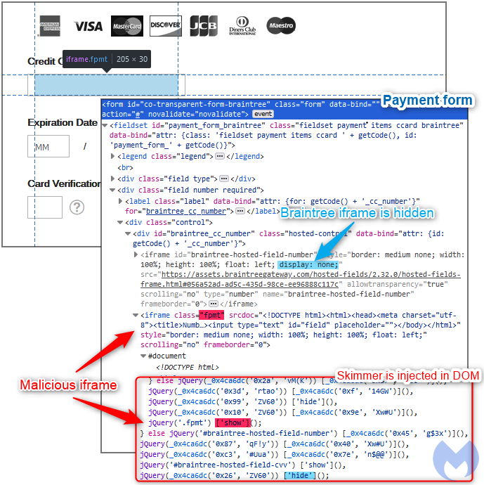 As you can see in Figure 2, the legitimate Braintree iframe (braintree-hosted-field_number) has its display property set to none while a malicious iframe (fpmt) takes it place.
