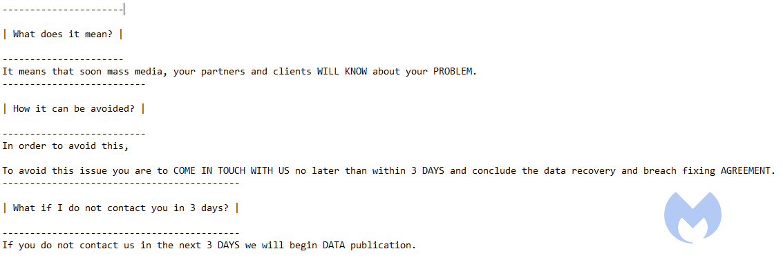 According to the ransom note, if the ransom is not paid by the company within 3 days, and aside from leaking part of the stolen data, the attackers will announce the breach through mass media so the company’s partners and clients will know that the company was victimized.