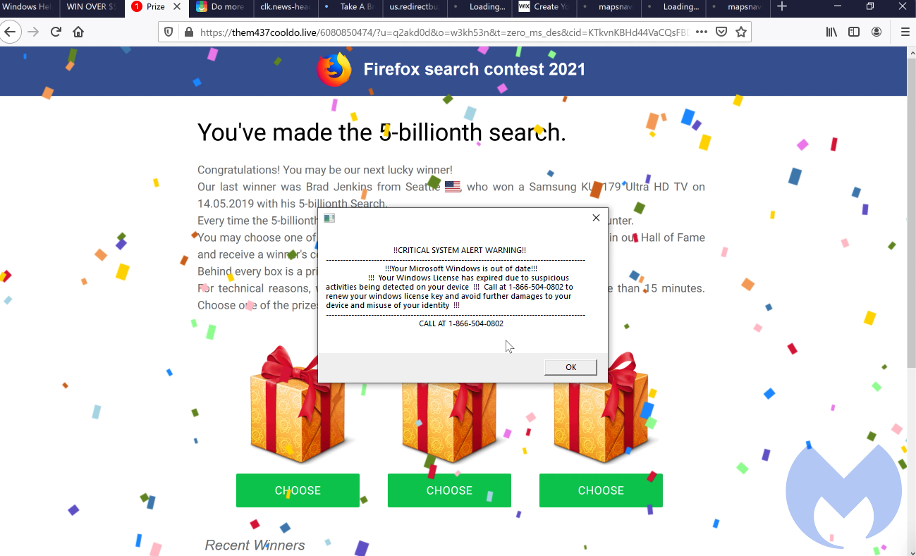 After a restart, we see an alert dialog about the Windows license being out of date. This message keeps on showing despite clicking the OK button and also starts to open a number of browser windows to mimic some kind of malware infection.