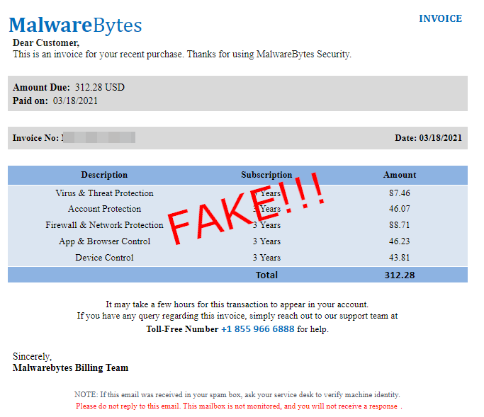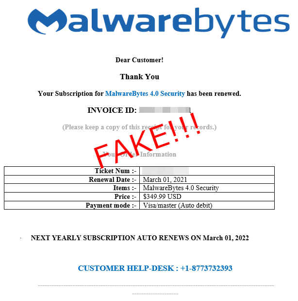 We’ve been tracking a fraudulent scheme involving renewal notifications for several months now. It came to our attention because the Malwarebytes brand as well as other popular names were being used to send fake invoices via email.