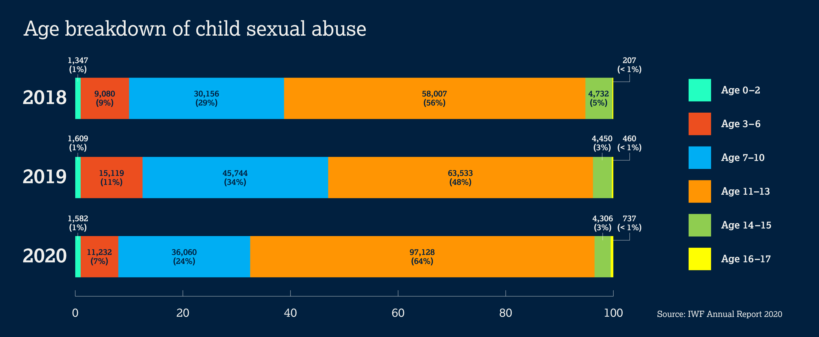 The majority of child victims are female. There has been an increase in the number of female child victims since 2019. In 2020, the IWF has noted that 93 percent of the child sexual abuse material (CSAM) they assessed involved at least one (1) female child. That’s a 15 percent increase compared to numbers in 2019.