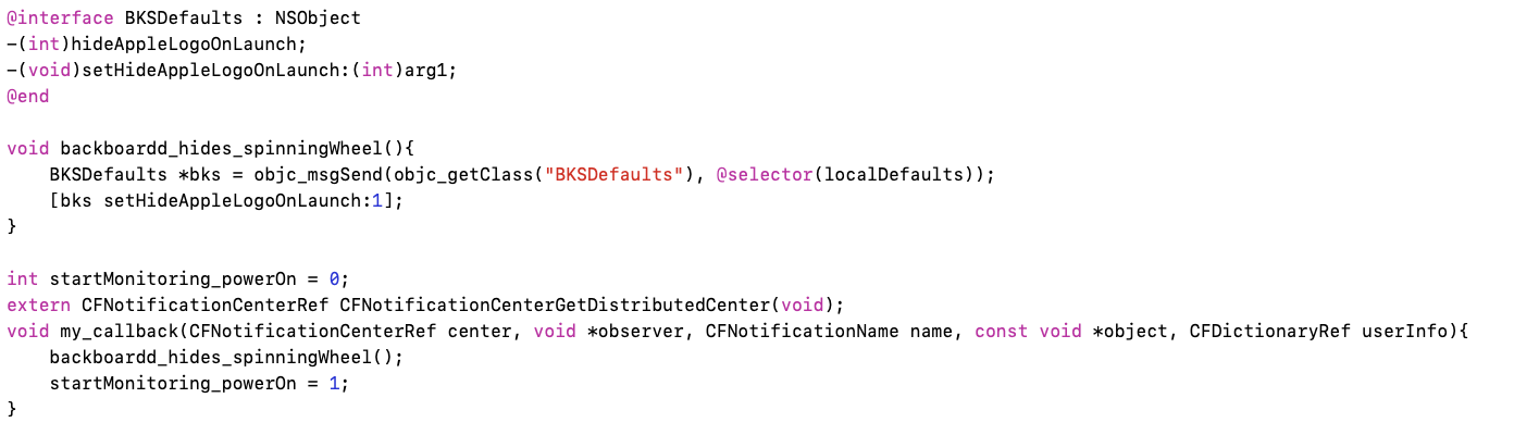 Just as the device shutdown is simulated, NoReboot can also simulate a device to startup. And the BackBoardd daemon plays a huge role in this. Since SpringBoard is no longer functioning, Backboardd takes control of the screen and responds to user inputs, including long button presses. Backboardd is told to show the Apple logo, a known indicator that the iOS device has indeed been turned off, which makes users let go of the button and stop them from truly rebooting the device. Then SpringBoard is relaunched so Backboardd can give back its privilege to control the screen.