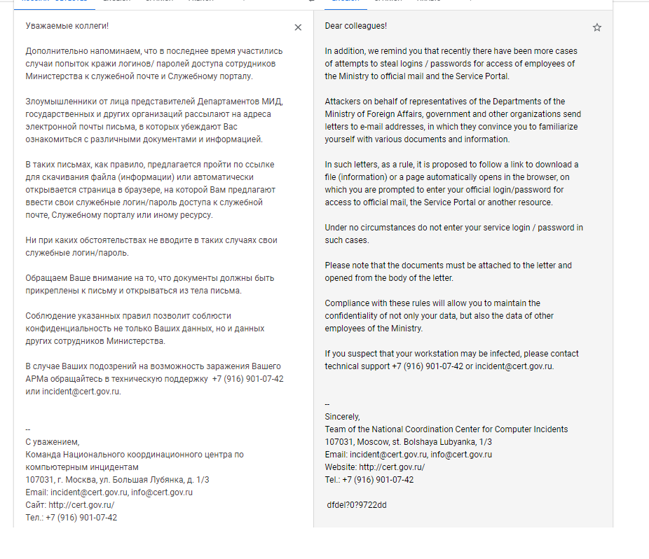 Dear colleagues! In addition, we remind you that recently there have been more cases of attempts to steal logins / passwords for access of employees of the Minsitry to official mail and the Service Portal. Attackers on behalf of representatives of the Department of the Ministry of Foreign Affairs, government and other organizations send letters to e-mail addresses, in which they convince you to familiarize yourself with various documents and information. Under no circumstances do not enter your service login / password in such cases. Please note that the documents must be attached to the letter and opened from the body of the letter. Compliance with these rules will allow you to maintain the confidentiality of not only your data, but also the data of other employees of the Ministry. The Tonto Team used Royal Road (sometimes called “8.t”) to create the malicious RTF file. First analyzed by nao_sec, Royal Road is a document builder that gives threat actors the ability to embed malicious code within RTF files, aiding actors in compromising target systems.