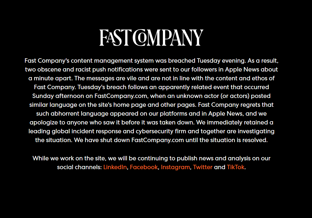 On Thursday, Fast Company’s website was displaying a statement regarding the hack on a black background.