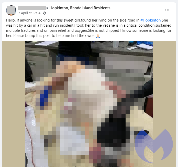 Hello. If anyone is looking for this sweet girl, found her lying on the side road in [hashtagged location name]. She was hit by a car in a hit and run incident.I took her to the vet. She is in a critical condition,sustained multiple fractures and on pain relief and oxygen.She is not chipped. I know someone is looking for her. Please bump this post to help me find the owner.