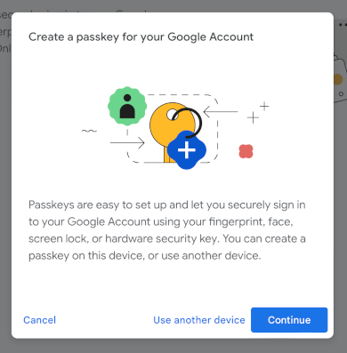 2. Click Create a passkey. An overlay will display, confirming that you can create a passkey on the device. Click Continue.