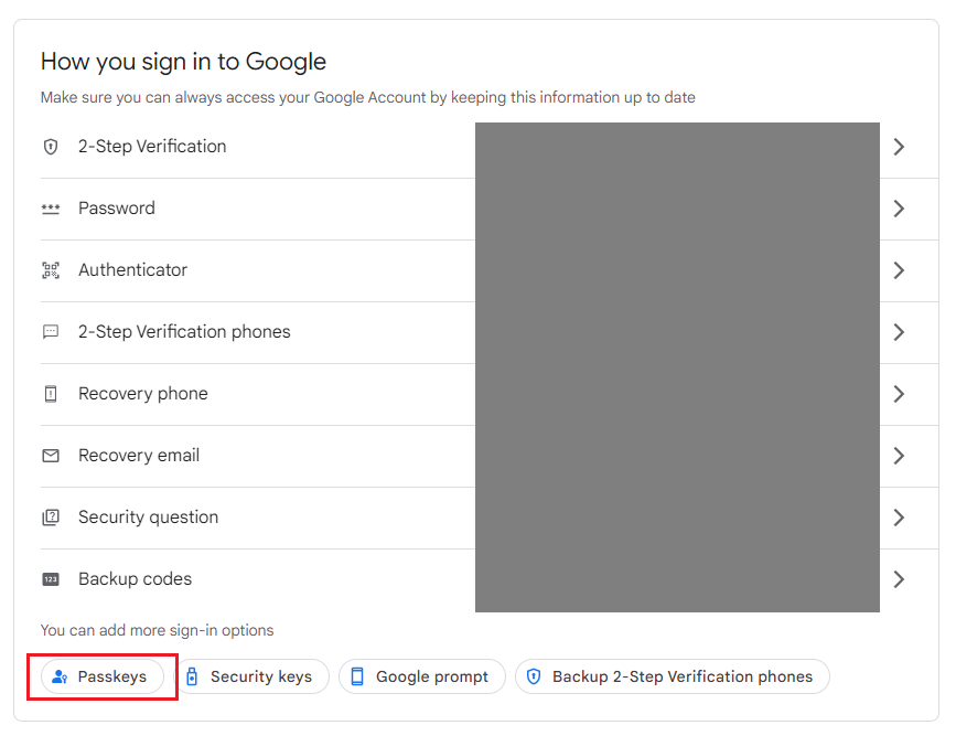 You can also log in to your Google account. From the Home page, go to Security. Scroll down to How you sign in to Google and pick Passkeys as an added sign-in option. You’ll land on the same page as above.