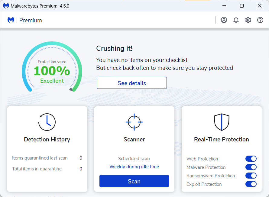 Malwarebytes’ new Trusted Advisor dashboard provides an easy to understand assessment of your Windows computer’s security with a single comprehensive protection score, and clear, expert-driven advice.