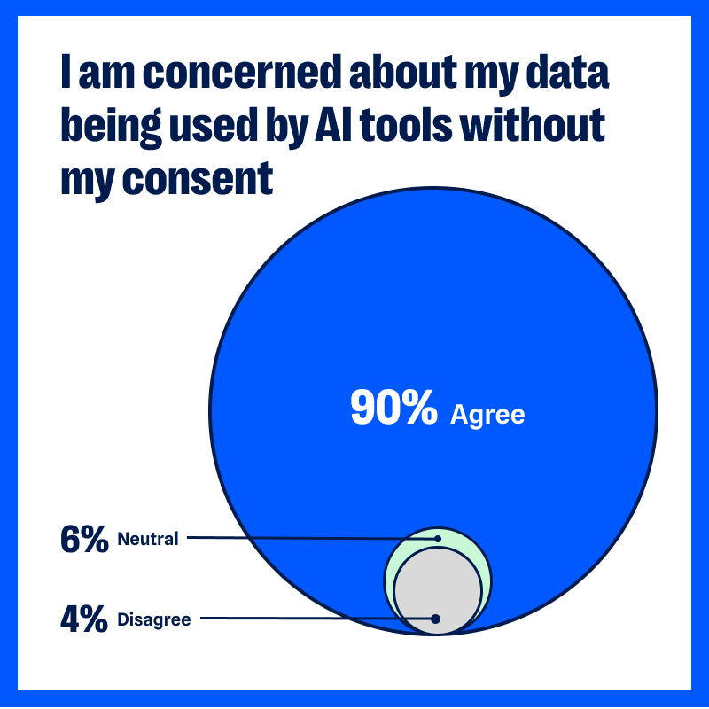 In our latest privacy pulse survey, in which we gathered 1,200 responses from readers of the Malwarebytes newsletter earlier this year, 90% of respondents said they’re worried about AI using their data without consent.