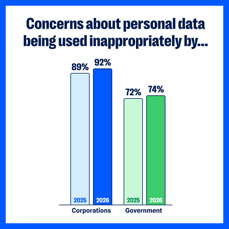 - 92% are concerned about their “personal data being used inappropriately by corporations,” which is up slightly from last year (89% in 2025)