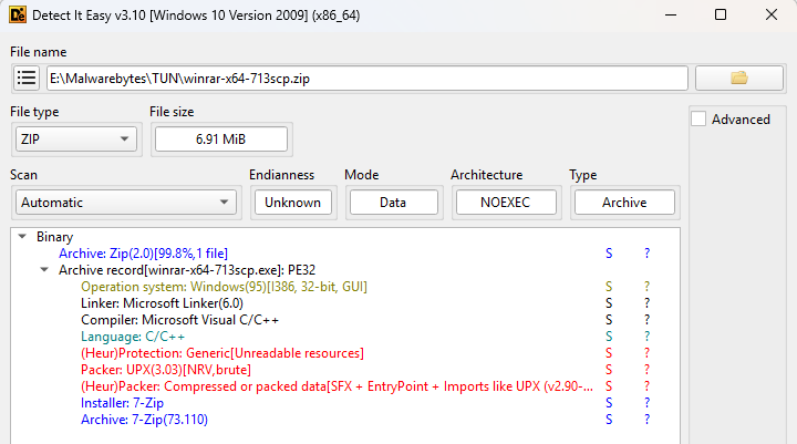 The original file was called winrar-x64-713scp.zip and the initial analysis with Detect It Easy (DIE) already hinted at several layers.