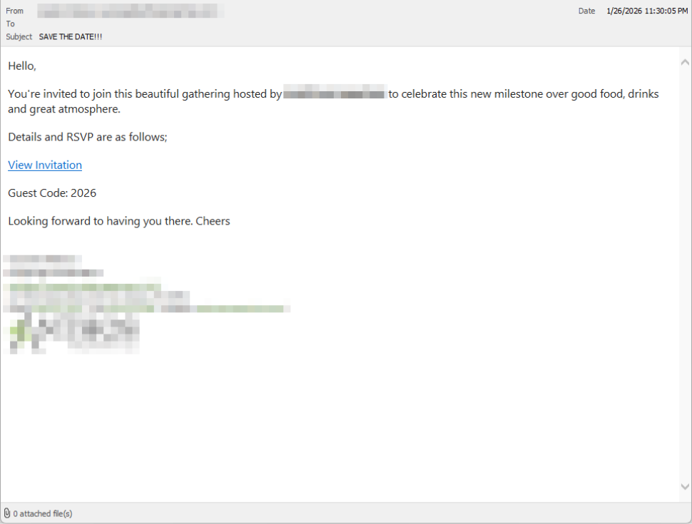 Victims receive an email framed as a personal invitation—often written to look like it came from a friend or acquaintance. The message is deliberately informal and social, lowering suspicion and encouraging quick action.