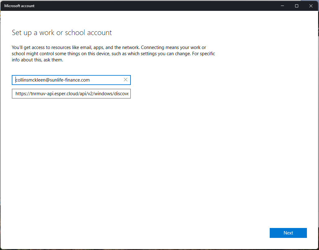 The moment a visitor clicks, Windows bypasses the browser and opens its native Set up a work or school account dialog. That’s the same prompt that appears when a corporate IT team provisions a new laptop.