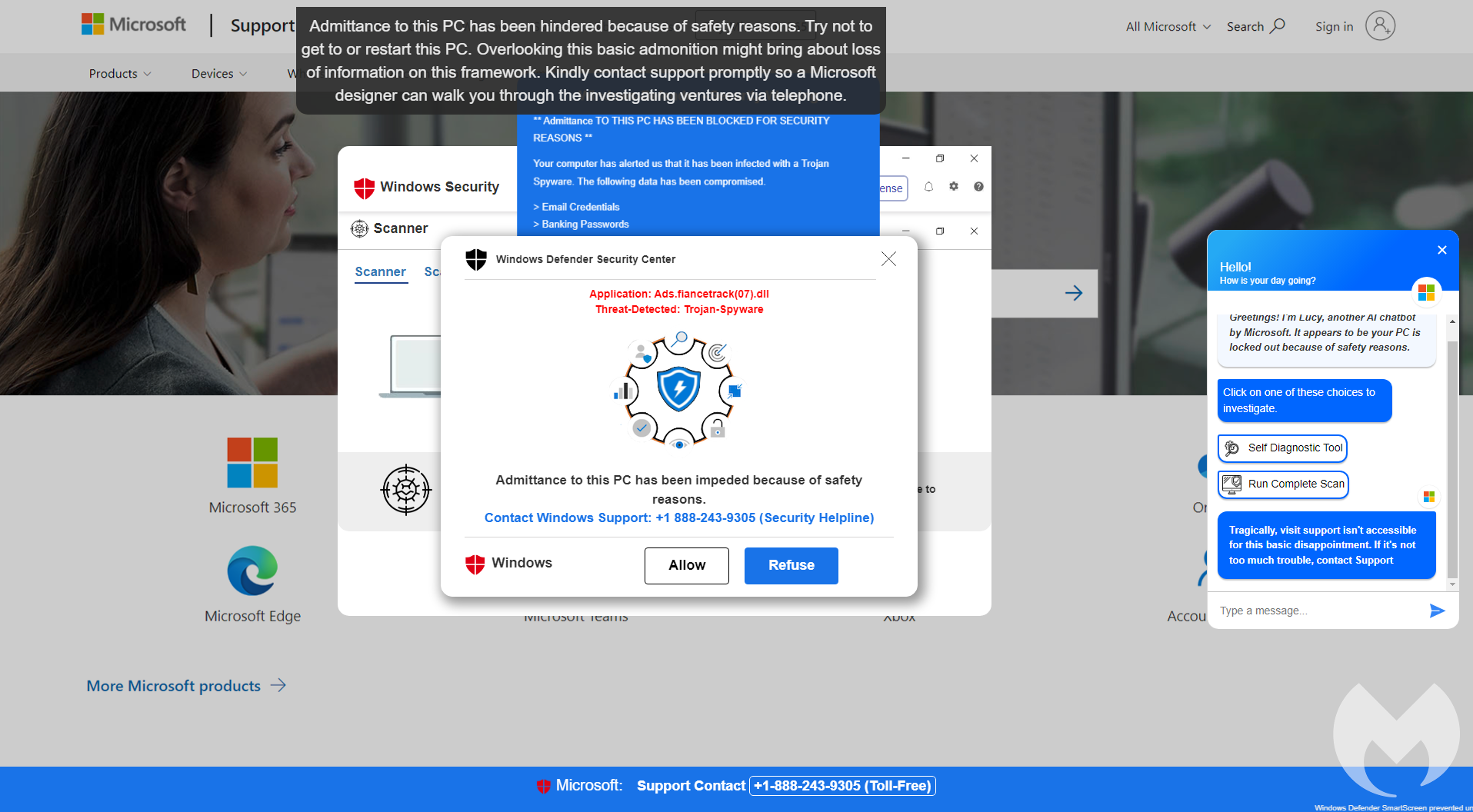 In this case they are also abusing a browser feature that remaps keystrokes when a page is in fullscreen by targeting the navigator.keyboard.lock API. What this means in practical terms is that the user will not be able to exit from the fullscreen page unless they press and hold the Escape key for several seconds. Many people will panic and call the phone number on the screen, only to fall in the hands of scammers and lose hundreds, sometimes even thousands of dollars.