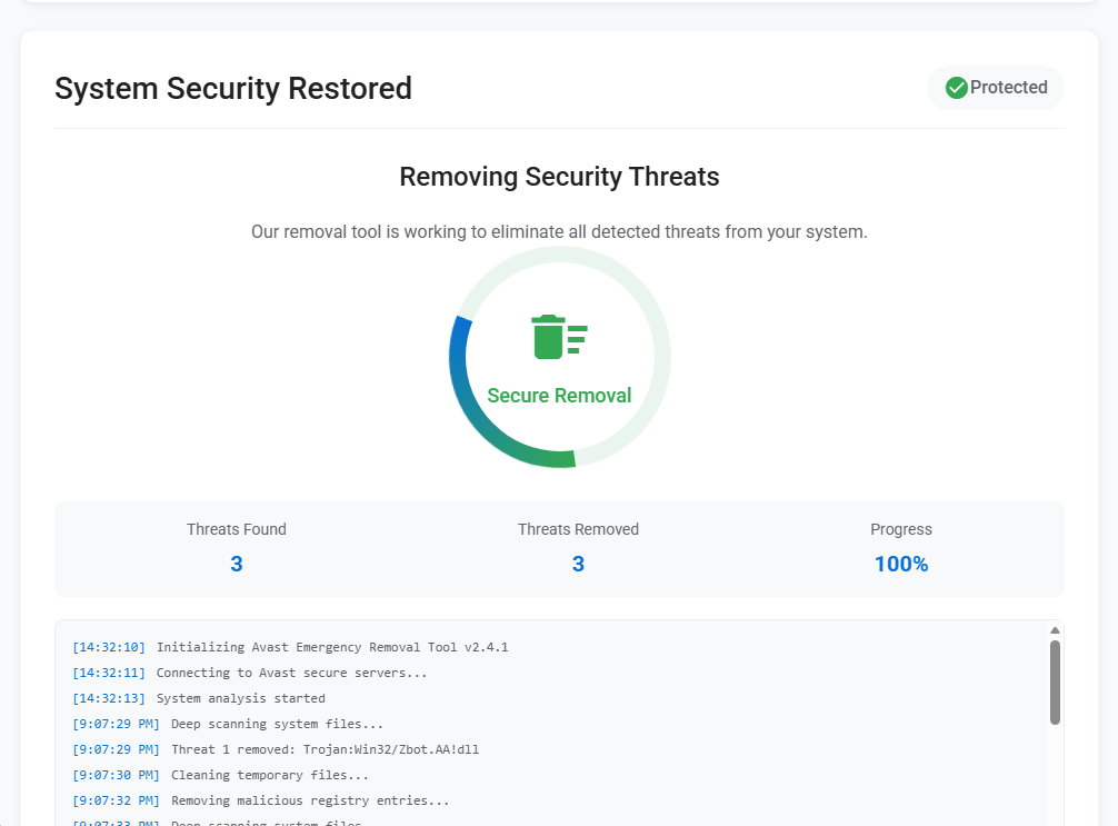 Strona phishingowa stanowi wierną kopię serwisu marki Avast, wraz z paskiem nawigacyjnym, logo i budzącymi zaufanie znakami certyfikacji. Odwiedzający są zachęcani do uruchomienia czegoś, co wygląda na kompleksowe skanowanie antywirusowe. Po kliknięciu strona wyświetla krótką animację, po czym podaje z góry ustalony wynik: wykryto trzy zagrożenia, usunięto trzy zagrożenia, system zabezpieczony. Przewijany dziennik konsoli wymienia konkretne wykryte zagrożenia—Trojan:Win32/Zbot.AA!dll—aby nadać przedstawieniu charakter konkretności. Następnie ofiara otrzymuje polecenie, by pobrać lekarstwo: plik o nazwie Avast_system_cleaner.exe.