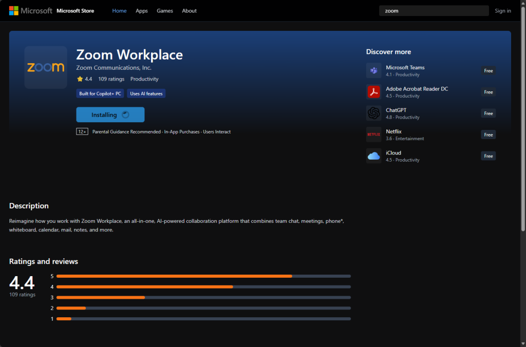 Quando o contador chega a zero, o navegador recebe a instrução de baixar um arquivo silenciosamente. No mesmo momento, a página muda para o que parece ser a Microsoft Store, mostrando o “Zoom Workplace” em meio à instalação, girando e tudo mais. Enquanto o visitante assiste ao que parece ser uma instalação legítima resolvendo o problema, o instalador real já foi parar na pasta Downloads — e não pediu permissão em nenhum momento.