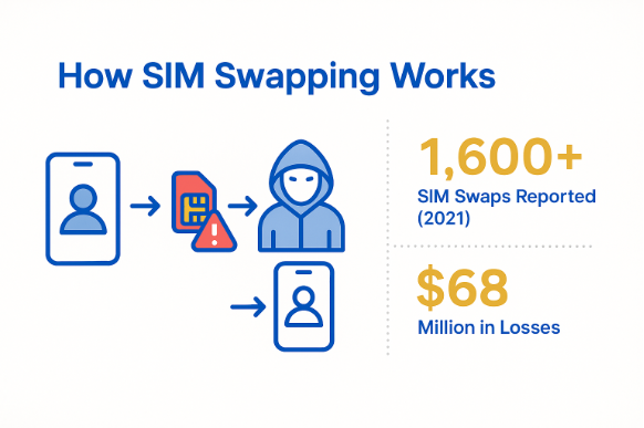 A troca de SIM ocorre quando um fraudador convence sua operadora de celular a transferir seu número de telefone para um cartão SIM que ele controla. A transferência pode ser feita por telefone ou mesmo pessoalmente em uma loja; os golpistas se passam por você e alegam que o SIM original foi perdido ou danificado.