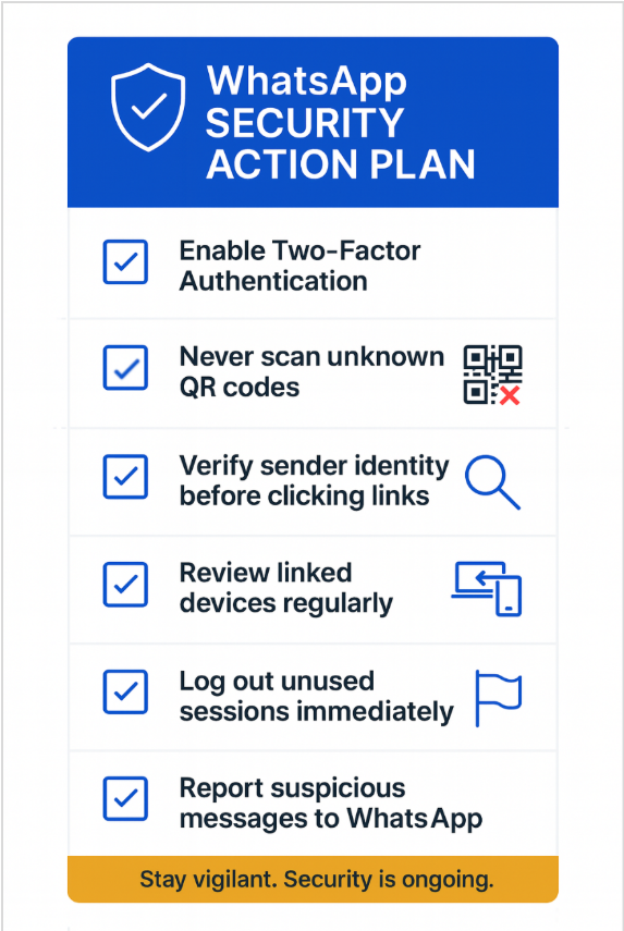 - Habilite a autenticação de dois fatores (2FA) no WhatsApp e em todas as contas financeiras ou de e-mail para adicionar uma camada extra de proteção.