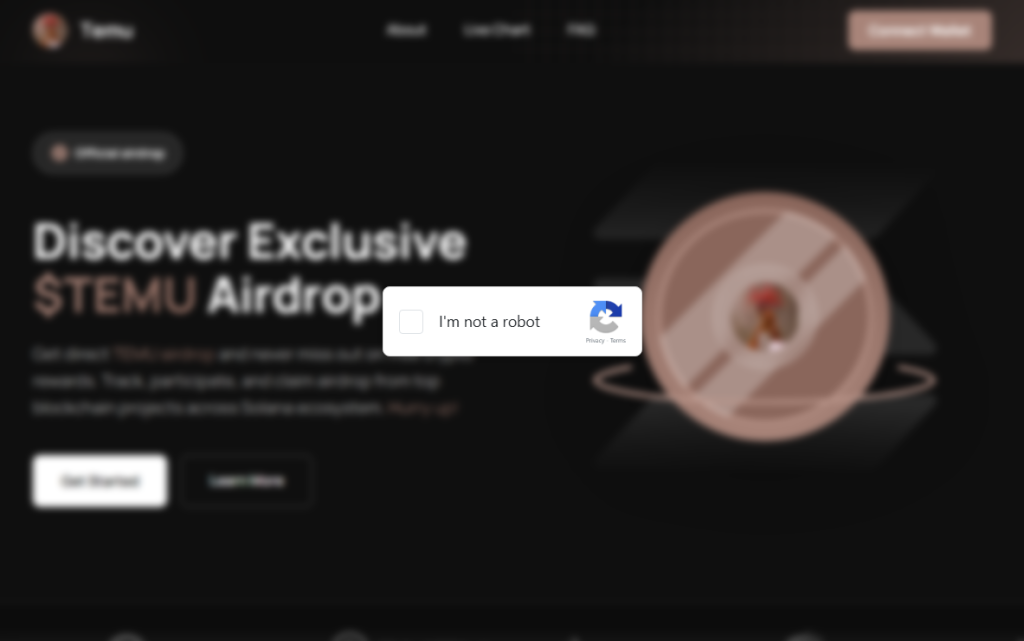 Приманкой этой кампании является тщательно проработанный поддельный веб-сайт, имитирующий аирдроп криптовалюты $TEMU.«Откройте для себя эксклюзивный аирдроп $TEMU», — гласит , украшенный логотипом и панелью навигации, стилизованными под легитимный криптопроект. Такой монеты не существует. Сайт создан исключительно для того, чтобы посетители нажимали на поддельный флажок«Я не робот».
