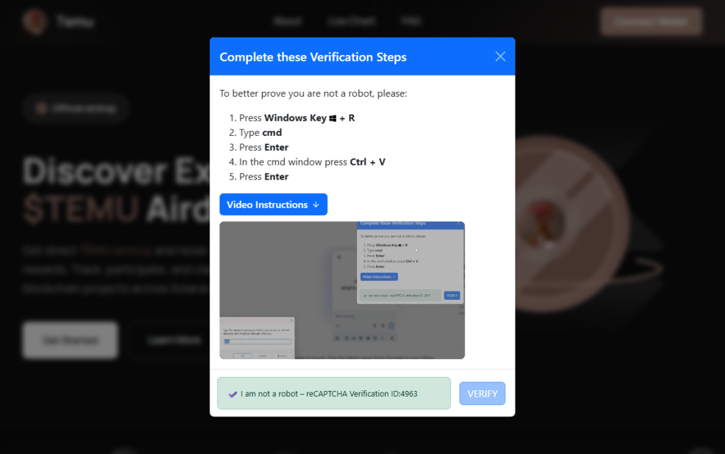 Для тех, кто колеблется, есть кнопка«Видеоинструкции», которая открывает встроенную запись экрана, демонстрирующую последовательность нажатий клавиш. По сути, это учебник в стиле службы поддержки, который помогает жертвам выполнить команду злоумышленников. Внизу модального окна находится поддельный значок reCAPTCHA с надписью«Идентификатор проверки: 4963», что придает ему вид законной проверки безопасности. Отличительной особенностью этой кампании является все, что происходит после нажатия клавиши Enter.